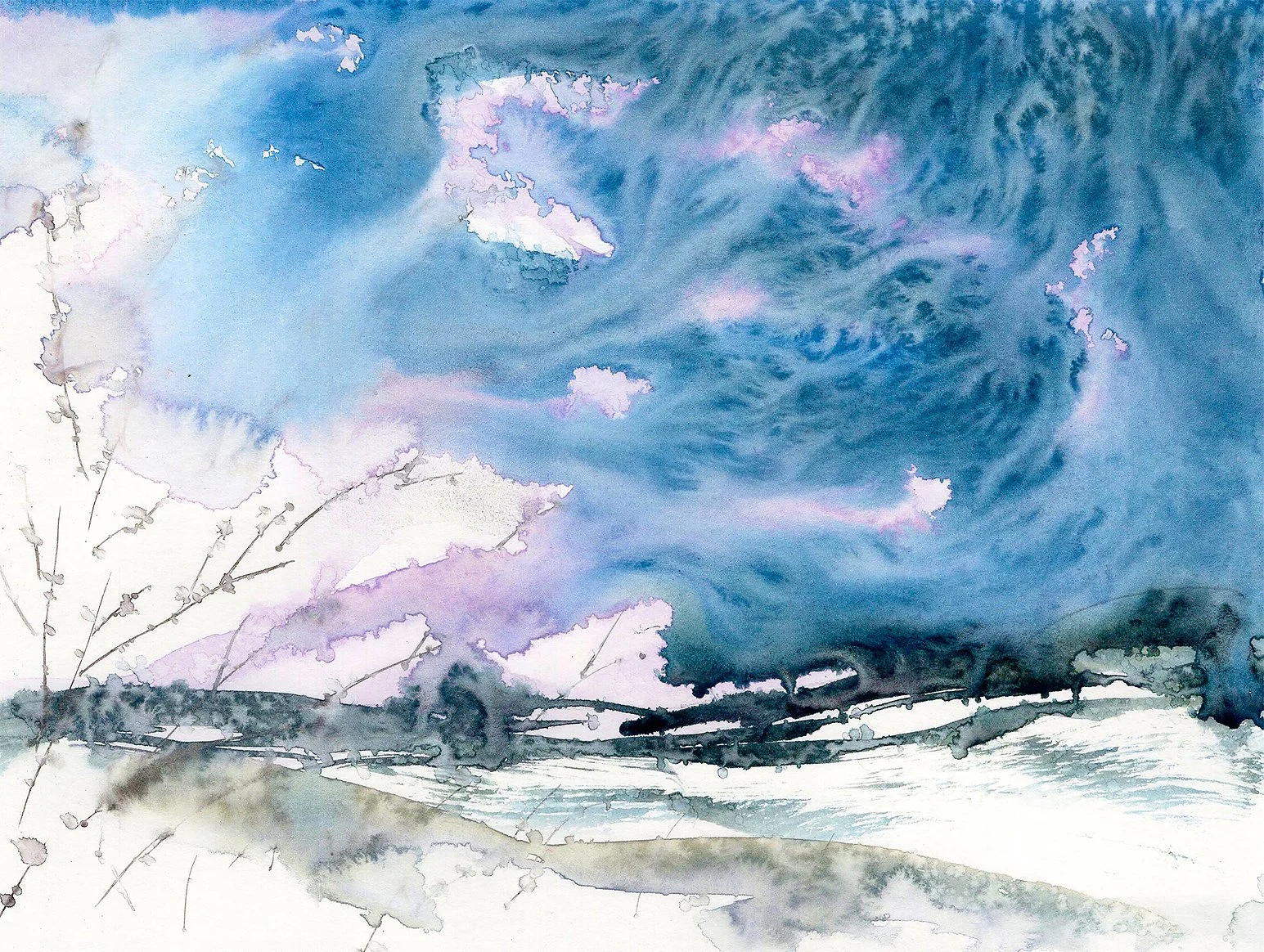 Watercolor painting of a winter landscape with snow-covered ground, leafless trees, and a sky filled with swirling clouds in shades of blue, pink, and purple. View fullsize